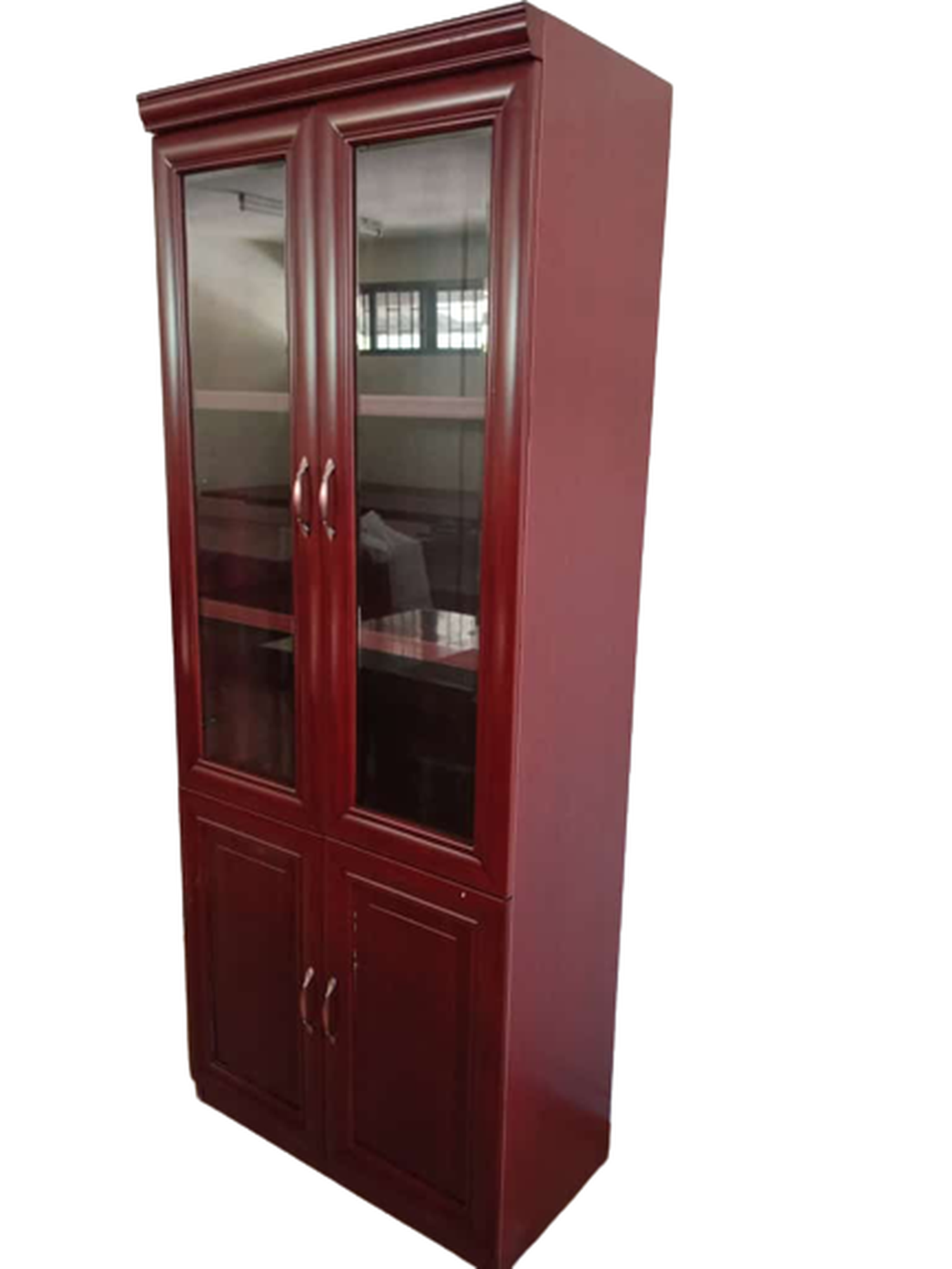 Quality wooden office cabinet mad of quality, durable wood. It has two lockable door on the upper side and the other 02 lockable doors on the lower side. Each lock has a pair of keys.