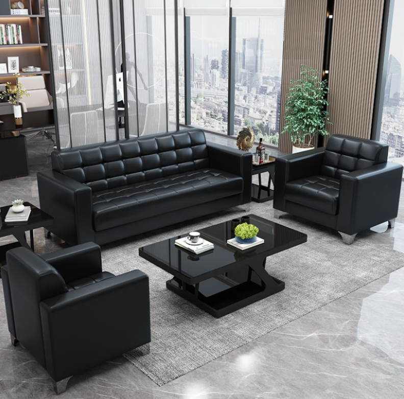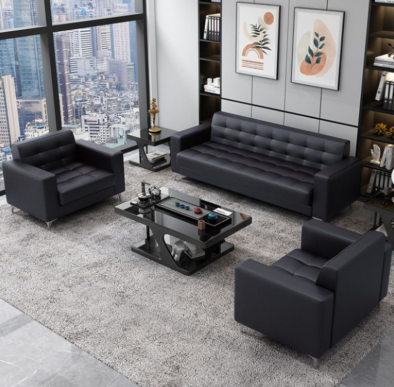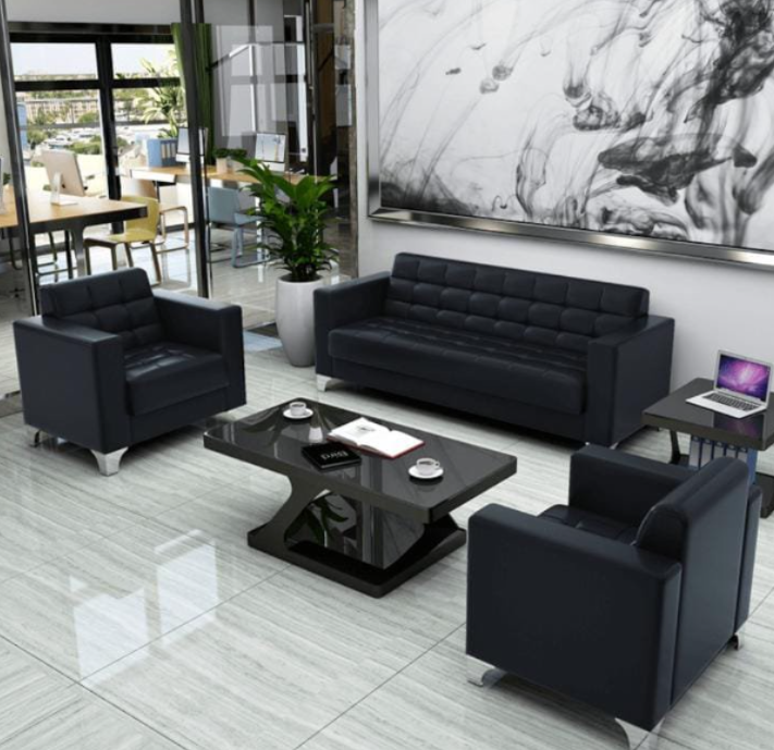 The Black Leather Executive Sofa set is designed with high-quality black leather upholstery, offering a sleek and professional aesthetic that enhances any office or reception area.