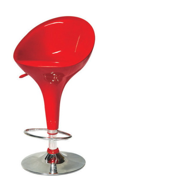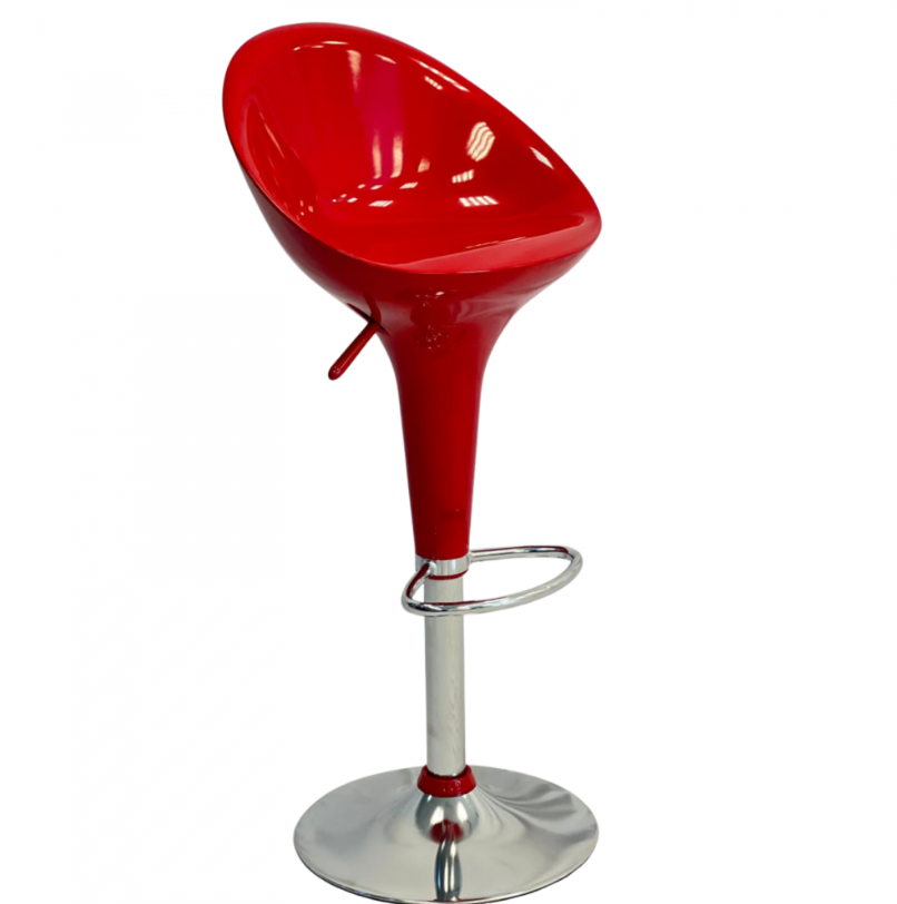 The wide, circular chrome base ensures stability and balance while complementing the vibrant red seat with a sleek metallic touch.