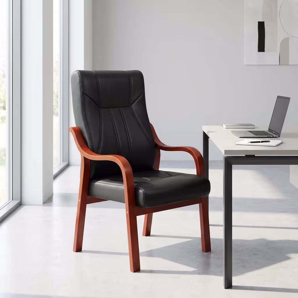 Built with ergonomics in mind, the chair features a cushioned seat and backrest that provide support during long meetings or waiting periods. The padded armrests add extra comfort, while the sturdy frame ensures stability and long-lasting use. The leather upholstery is resistant to wear and simple to clean, making it ideal for high-traffic office environments.
